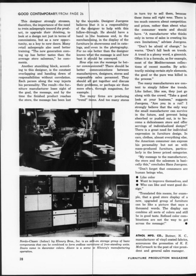 Feature on Juergens and the Deco House chair in Furniture Production July, 1965